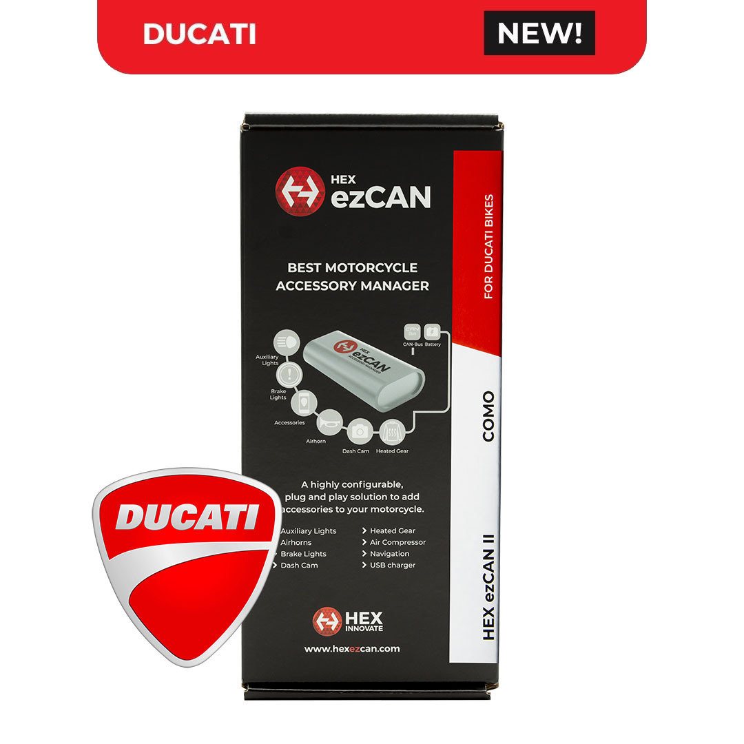 The ezCAN plugs directly into your Ducati and listens to CAN-bus. It provides you with a highly configurable, seamless plug and play solution to add accessories to your bike without the need to cut any wires that could void your warranty!
