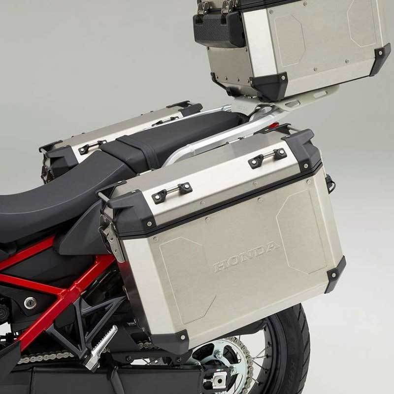 Made of strong and light aluminium, this set includes the OEM Honda Rear Carrier, Pannier Frames and 2 Panniers presenting a capacity of 33Ltr on the right side and 37Ltr on the left.