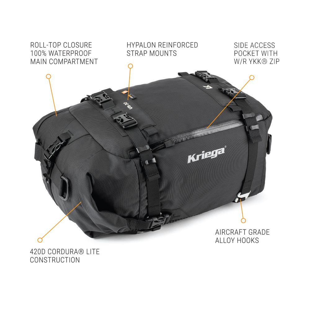 - Use individually or hook-on additional US-Drypacks to build your ideal luggage system up to 70 litres.