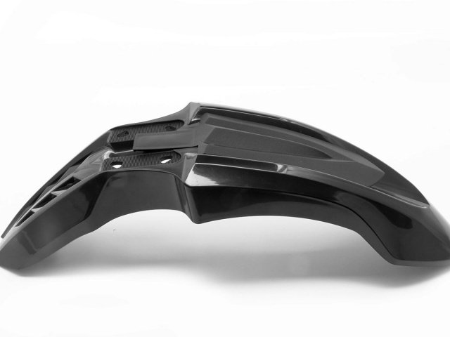 - The fender is a mid-length plastic fender, pre-drilled for mounting, and attaches with our custom laser cut, formed, welded, and powder-coated steel upper bracket.