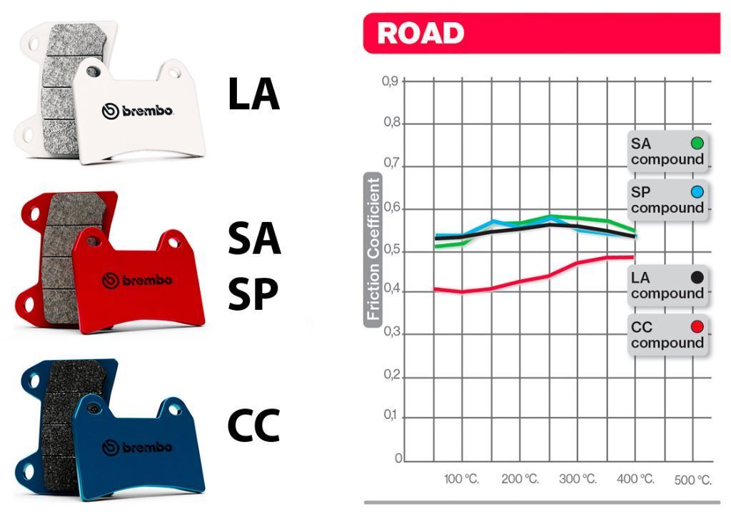 - LA sintered compound intended specifically for front brakes, typified by particularly good efficiency under all operating conditions. Performance similar to SA compound but with exceptional durability (about 30% higher than the SA compound).