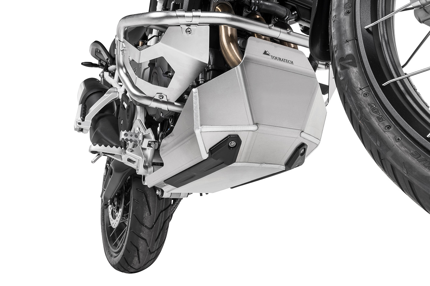 Touratech have attached great importance to its robustness and functionality. Serious damage, such as holes in the engine block, can be effectively prevented by fitting the large Touratech engine guard.