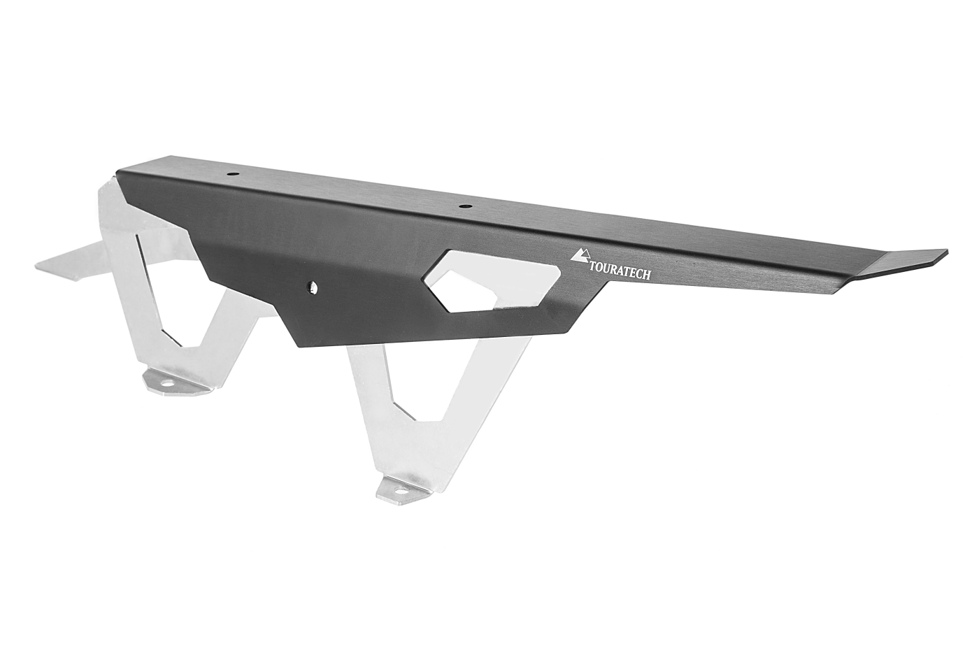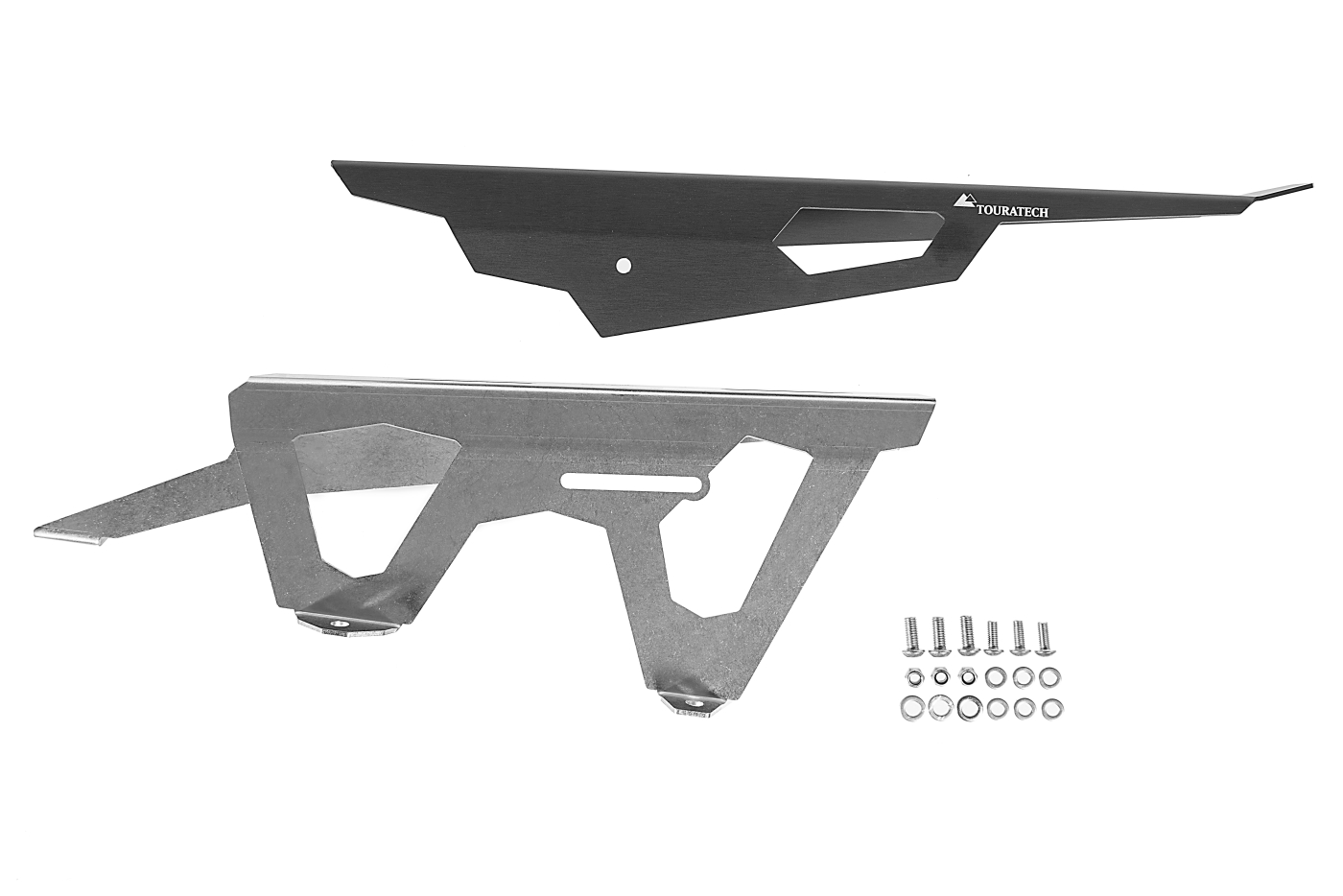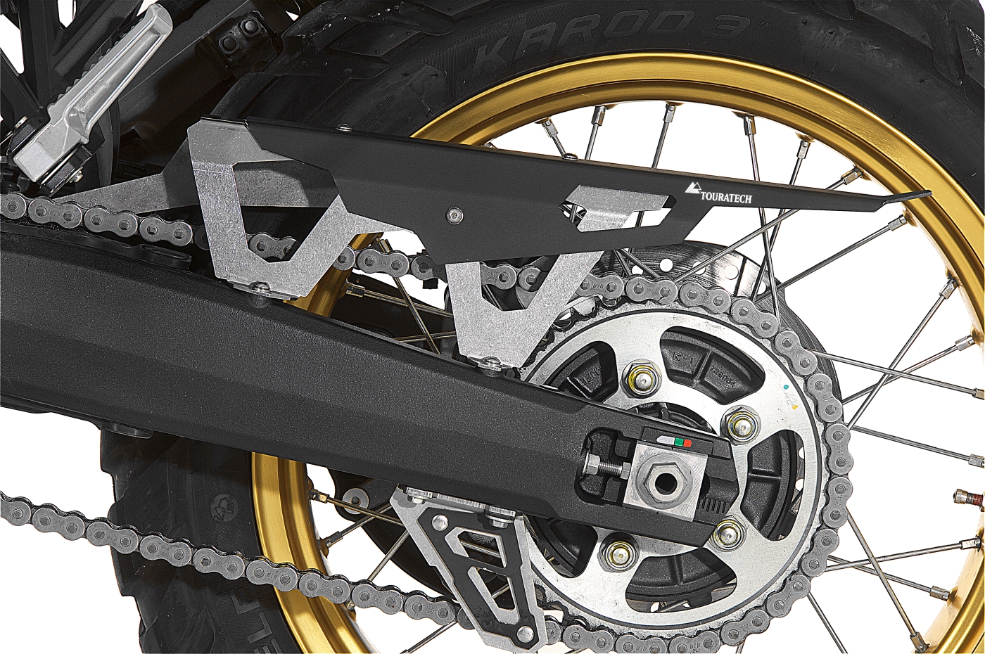 Touratech’s chain guard for the Africa Twin. Much sturdier than the original plastic part, the Touratech chain guard is made from stainless steel and aluminium yet is still relatively light. Visually the metal chain guard fits much better with the overall concept of a touring enduro like the CRF1000L.