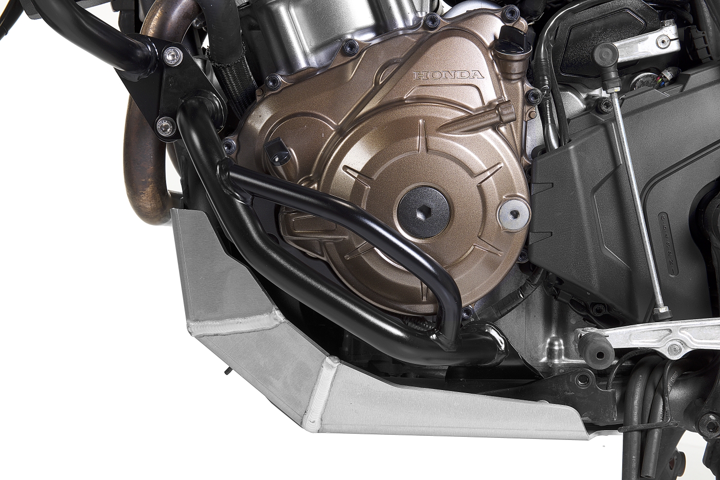 Touratech’s engine crash bar provides optimum protection for the engine’s important side panels. Its slender design does not affect the lean angle at all and means you can ride on difficult single trails off-road as well as on-road. Made from resilient stainless steel, the engine crash bar gleams thanks to its high quality electropolished/ black finish. It perfectly complements the Honda CRF1000L. The crash bar is made of high quality, electropolished stainless steel and extends the range of use of your travel enduro. The two-component crash bar was fitted as close as possible to the vehicle to give harmonious integration into the existing vehicle design. Its special design provides optimal force dissipation. The crash bar is simple to install, rust-proof and easy to care for. Together with the Touratech fairing crash bar for your Africa Twin, you need never fear a fall again.