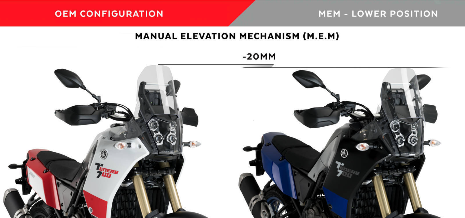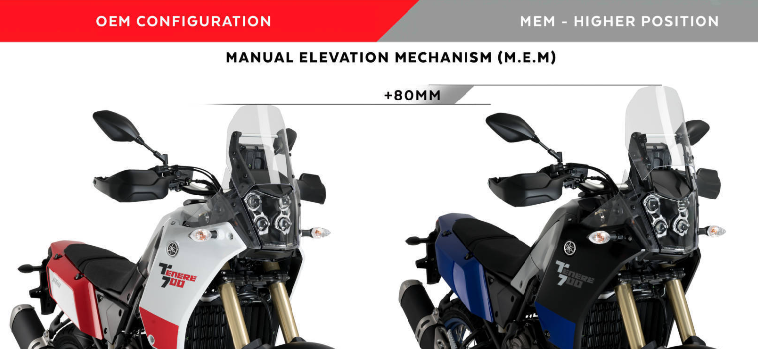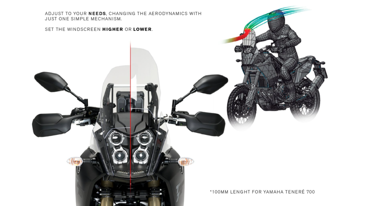 Improves the performance of your Yamaha Tenere 700 and provides it an aerodynamic adaptable protection to every moment and situation of your driving thanks to the M.E.M. (Manual Lifting Mechanism) for your screen.