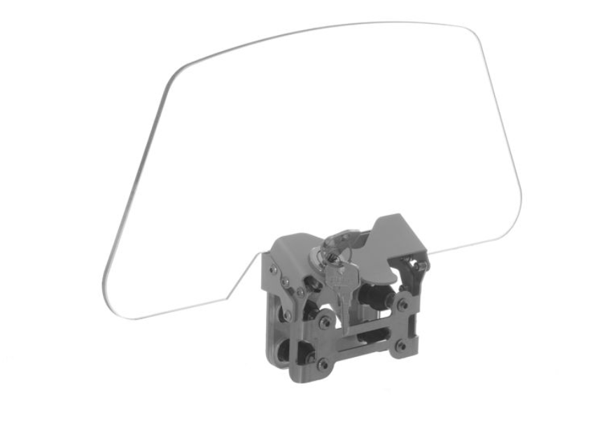 The risk of injury posed by a high windscreen when riding off-road is, thus, not present. This version of the spoiler for the windscreen is lockable, thereby providing a certain degree of protection against quick unmounting of the spoiler or thieves.