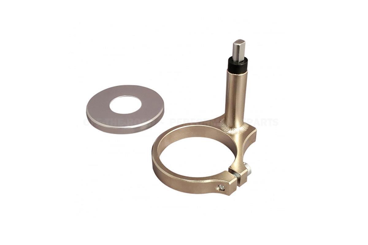 The steering damper is installed below the new handlebar clamps on a holder CNC milled from solid material. The counter-holder, which is made of nickel-plated steel, is also milled and screwed to the frame. Furthermore, it is responsible for absorbing the steering forces.