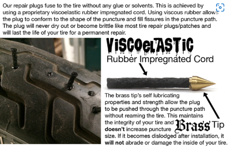 Dynaplug® tubeless tire repair plugs are constructed from viscoelastic rubber impregnated cord and non-abrasive brass tip.