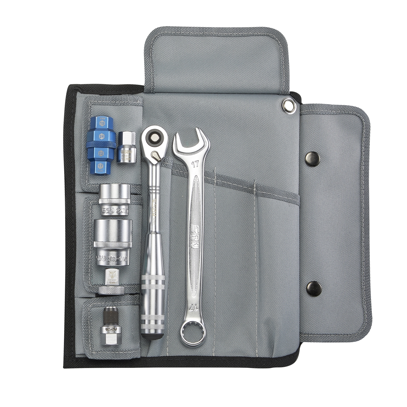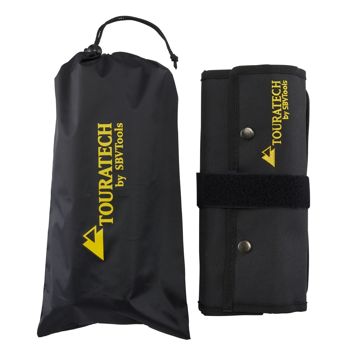 This robust double layer roll-up bag, weighing only 2.45 kg, offers a professional motorcycle toolset made of the best materials: S2 bits with black phosphate rust protection. Sockets and spanners are Cr-V satin chrome-plated. With its compact dimensions, there is always a place somewhere on your bike for this motorcycle toolbag in Touratech design.